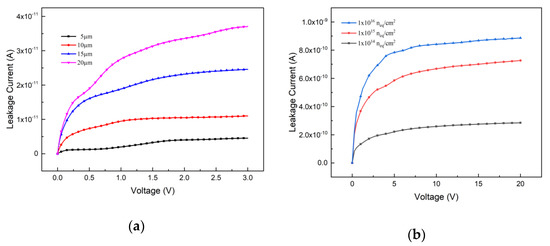 Figure 2. Leakage current curves v.s. bias voltage; (a) With the influence of the electrode spacing; (b) With the influence of the radiation fluence.