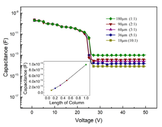 where εrε0 is the product of relative and vacuum permittivity, d is the length of the column, and R/r is the ratio of the outer electrode radii and inner electrode radii of the detector. Figure 3 shows the capacitance v.s. bias voltage curves at different lengths of the column electrode. As we calculated above, the capacitance increases linearly with the column electrode length and they are all less than 100 fF.