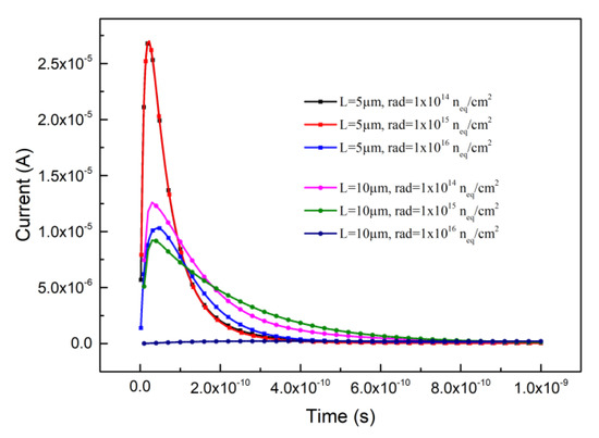where μ is the carrier’s low field mobility, and E is the electric field in the detector. Current signals are obtained through simulation, as shown in Figure 4. The incident position of MIP was simulated not randomly, but from the middle position of the effective silicon body of the detector. Figure 4 shows that increasing in radiation and electrode spacing will reduce the induced current by affecting the intensity of the electric field [40] and trapping carriers through the defect. In addition, from Figure 4, it is shown that the transient times corresponding to the signal FWHM are ranging from 1 × 10−10 s to 3 × 10−10 s, namely 100 ps to 300 ps. And current signal peaks are located below 100 ps.