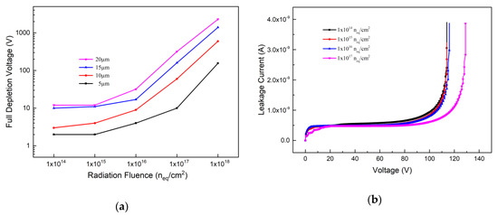 The full depletion voltage can be extracted from the C-V and I-V curves. Figure 5a presents the variation trend of full depletion voltage with radiation fluence. The full depletion voltage is only a few volts after radiation with fluence of 1 × 1014 neq/cm2 while electrode spacing is ranging from 5 μm to 10 μm. When the radiation fluence is increased to 1 × 1018 neq/cm2, the detector full depletion voltage with electrode spacing of 20 μm is increased up to 1150 V. However, the full depletion voltages with electrode spacing of 5 μm and 10 μm are still below 500 V. Usually, the working bias voltage is larger than the full depletion voltage, which indicates that with very small electrode spacing, even at a very high radiation fluence, bias voltages of several hundred volts can make the device work. In Figure 5b, the abscissa of the inflection point of the curve rising sharply is the breakdown voltage point. From Figure 5b, one can observe that the breakdown voltage will increase with the radiation fluence for the detector with an electrode spacing of 5 μm, and it is about 115 V at radiation fluence of 1 × 1016 neq/cm2, much larger than the full depletion voltage (about 3 V here).
