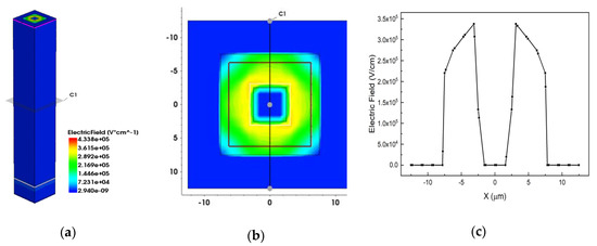 Figure 6 show the 3D, 2D and 1D electric field distributions above the breakdown voltage (150 V here) with electrode spacing of 5 μm. Figure 6b is the C1 profile from Figure 6(1). Figure 6c is the C1 cutline from Figure 6(2). From Figure 6, we can observe that the electric field of most detector effective area is larger than 3 × 105 V/cm, which indicates that the detector has been breakdown.