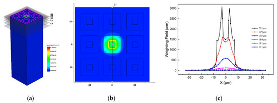 Which presents that the charge collection of the device is influenced by the weighting fields distribution in the device effective area. Figure 7 presents the weighting field of the 3 × 3 array. From Figure 7c, one can observe that the weighting field decreases as the Z axis decreases, and the trench electrode is acted as a good isolation. Higher specific weighting field values ensures better charge collection of the detector.