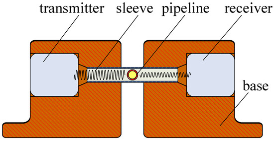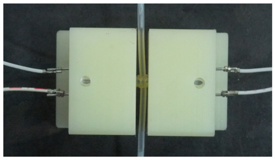 The ultrasonic probe is a device that can transmit and receive ultrasound. Therefore, it is the key part of the microbubble-detection system. We selected the T40-160 and R40-160 piezoelectric ultrasonic devices (Audio Well Electronics Ltd., Guangzhou, China) as the transmitter and receiver. A higher ultrasonic frequency will detect smaller bubbles because of its smaller diffusion angle and better sonic wave directional characteristic, but the higher frequency signal has a lower anti-interference ability. In this paper, the ultrasonic frequency was 40 kHz, and the distance between the receiver and pipeline was no more than 10 mm. The structure of the probe is shown in Figure 1. We designed a sleeve joint between the transmitter and receiver. The micropipeline went through the side of the sleeve perpendicularly. The sleeve’s inner diameter was fit to the outer circumference of the micropipeline. This sleeve structure can lessen the sonic energy dissipation during the transmitting process. The prototype of the probe is shown in Figure 2, which is a top view.