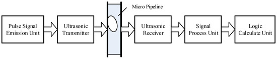 In recent years, due to the development of machine-learning techniques, bubble-detection methods using image processing have been widely studied, and such methods are able to obtain good results [12,13]. However, ultrasound is still a good choice to detect the bubbles in microtubes because of its good directional capability, penetrating ability, easy acquirement, greater accuracy, etc. Ultrasound techniques for bubble detection in flows can be classified into three groups: transmission techniques, Doppler techniques, and pulse techniques [14]. The transmission technique can measure bubble sizes. However, this technique has a low accuracy and position resolution. The Doppler technique is suitable for velocity field measurement, but is less used to measure the bubble size. The pulse technique measures the axial (along an ultrasonic beam) distance between the ultrasonic transmitter and a receiver or a reflecting object [15]. Applying the pulsed-ultrasound technique, the sizes and velocities of microbubbles in the flow in the tube can be obtained in real time. The detection process is not affected by the liquid color, nor the material of the microtubes.