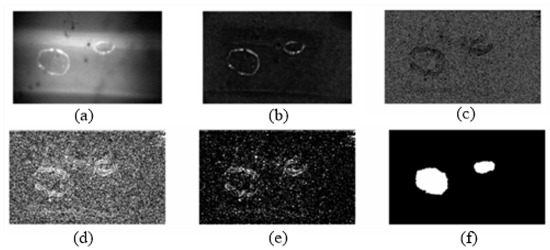 The processing of the bubble image. (a) Original image. (b) Background removed and brightness enhanced. (c) Edge detection. (d) Mathematical morphology expansion. (e) Mathematical morphology corrosion. (f) Bubble-edge-detection results.