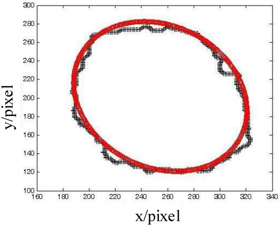 In our developed microbubble-detection system, the signal processing was so complex that many factors could affect the measurement precision, such as the accuracy of the A/D conversion, the modulation enlargement, the shaping filter circuit, etc. In the experiment, we took advantage of the digital-image-processing technology to calibrate this system accurately. First, distilled water was injected and aspirated into a 1.5 mm-diameter transparent pipeline repeatedly via a syringe pump in order to produce bubbles randomly. The syringe pump was the CARVO XL-3000 (Tecan Group Ltd., Mannedorf, Switzerland). Then, we allowed the bubble–fluid to flow through the pipeline smoothly. We used a high-speed camera to acquire a bubble image before the bubbles went through the ultrasonic probe. The ultrasonic signal was calibrated using the data of the bubble characteristics from the images. Two formulas were used to calculate the volume of the bubbles. When > 1.5 mm (diameter of the pipeline), the bubble volume was calculated with a cylinder; when < 1.5 mm (diameter of the pipeline), the bubble volume was calculated with a sphere volume. Figure 4 shows one of the serial images and its calculating process. There are two bubbles in the image. Combining the mathematical morphology algorithm and edge-extraction algorithm, the image was enhanced by removing the background, and the bubble edges were extracted. An ellipses was drawn to fit the bubble outline in order to estimate the bubble volume. Figure 5 shows the ellipse-fitting result of the larger bubble projection in Figure 4.