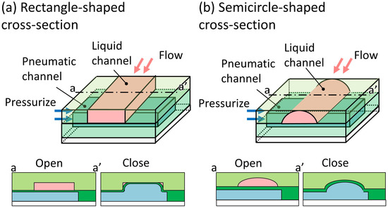 Conventional cross sections of microchannels of pneumatic pressure-driven microvalves. (a) Rectangle-shaped cross-section; (b) semicircle-shaped cross-section [26].