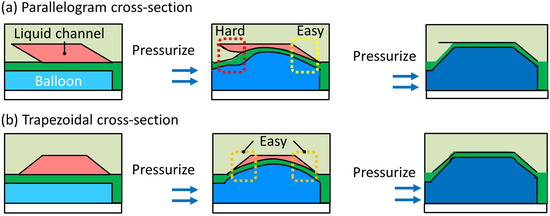 The maximum closing depth of the valve’s microchannel with the parallelogram-shaped cross-section was 100 m [26]. It requires a significantly high operating pressure to seal a deeper microchannel, even if the valve can operate without leakage at that operating pressure. This is because the overhang at the acute angle is thicker and thus more difficult to bend in accordance with the depth of the microchannel (Figure 2a). Therefore, we propose a trapezoid-shaped cross-section, as shown in Figure 2b. In the trapezoid-shaped cross-section, the inner angles of both sides are obtuse; thus, the microchannel can be sealed only by deformation of the membrane.