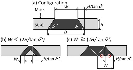As shown in Figure 3b, when W is shorter than 2H/tan, some areas are not fully exposed by double exposure. As shown in Figure 3c, when W is longer than 2H/tan, the entire trapezoid-shaped cross-section is doubly exposed. Simply, the minimum value of D of the trapezoid-shaped cross-section that can be fabricated with only double inclined exposure is 4H/tan. The angle of inclination during exposure and the angle of the fabricated structure can be expressed by Equation (2) below [29].