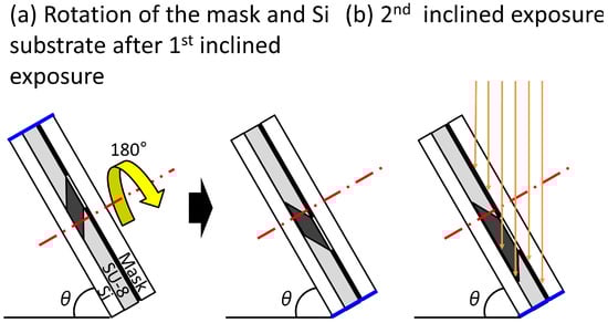 Figure 4 shows how the trapezoid-shaped cross-section molds are fabricated by the inclined lithography method. The mold was fabricated by changing the orientation of the substrate and repeating the inclined exposure. First, a pre-baked photoresist on a substrate is masked and fixed. Next, the mask and the substrate are inclined using a jig fabricated at a specified angle and exposed.Thereafter, the mask and the substrate are rotated at 180 degrees around the axis, as shown in Figure 4a, with the mask and the substrate fixed relatively. After the rotation and re-exposure, the cross-section of the exposed photoresist becomes trapezoidal in shape (Figure 4b). By developing the photoresist, a trapezoid-shaped cross-section mold can be fabricated.