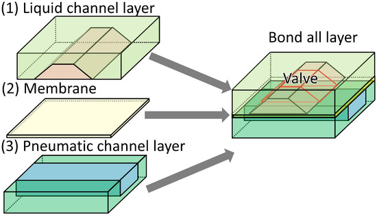 The microvalve consisted of three layers (Figure 5): a liquid channel, a membrane, and a pneumatic channel. The pneumatic and liquid channels were overlaid at the position of the microvalve. All the layers of the microfluidic device were fabricated by soft lithography and then bonded to each other (Figure 6). The microchannel in the liquid channel layer had a trapezoid-shaped cross-section, which was obtained by inclined photolithography.