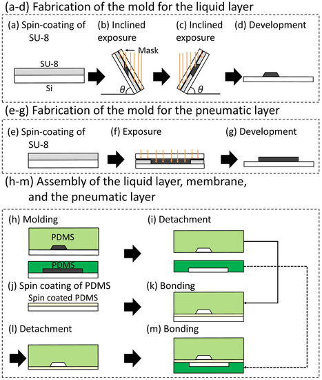 The complete fabrication process is as follows (Figure 6): (a) SU-8 (SU-8 2150, Microchem, Westborough, MA, USA) was spin-coated on a Si substrate. (b,c) A photomask of the liquid channel was aligned on the Si substrate. The substrate with the photomask was inclined at 60 degrees and exposed to ultraviolet (UV) light. The trapezoid-shaped cross-section was fabricated by changing the orientation of the substrate and repeating the inclined exposure. (d) The unexposed SU-8 was etched away in the development process, producing the mold of the liquid channel. (e–g) The molds for the pneumatic channel were fabricated by photolithography without inclining the substrate. (h) Polydimethylsiloxane (PDMS; Silpot 184 W/C, Dow Corning Toray, Tokyo, Japan (The base polymer to curing agent ratio was 10:1 by weight)) was cast into the molds of both channels. (i) The PDMS structures for the liquid and pneumatic channel layers were detached from the molds. (j) A membrane between the liquid channel and the pneumatic channel was fabricated by spin-coating PDMS on a flat Si substrate. (k) The PDMS structure for the liquid channel layer was bonded to a thin membrane on the flat Si substrate with surface activation by vacuum UV irradiation. (l) The bonded PDMS structure was detached from the Si substrate. (m) The bonded PDMS structure was attached to the pneumatic layer with surface activation by vacuum UV irradiation.
