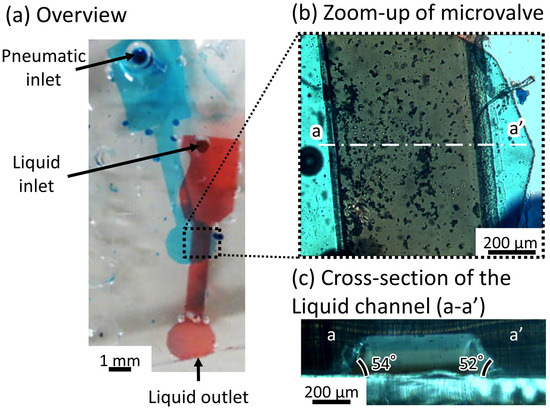 Figure 7a shows the fabricated microfluidic device. The liquid and pneumatic channels were filled with red- and blue-dyed water to improve visibility. Figure 7b shows a magnified image of the valve area. Figure 7c shows the cross-sectional view of the microvalve. Blue gradation on both sides of the liquid channel represents the obtuse-angled structure. The length of the liquid channel was set to 2 mm for ease of alignment. The width at the top, bottom, and the depth of the liquid channel were 500 m, 750 m, and 225 m, respectively. The diameter of the inlet was 1 mm. The thin membranes were 40 m thick. The angle of inclination during exposure was set to 60 degrees, which is similar to that of the previously developed microvalve with a parallelogram-shaped cross-section [26]. The maximum depth of the inflated pneumatic balloon was between 30 and 40 percent of the pneumatic channel’s [30] width. To close the 225-m deep liquid channel, the width of the pneumatic channel was set to 750 m. To prevent the pneumatic channels and the membranes from sticking [26], the depth of the pneumatic channels and the thickness of the membrane were set to 50 m and 40 m, respectively.