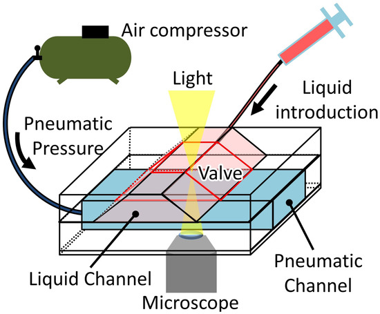 Microvalves are essential components in the development of highly integrated microfluidic devices because they are required for precise fluidic control [19]. Accordingly, a microvalve that can close a microchannel for handling large particles must be developed. Among the various types of microvalves that are integrated with microfluidic devices [20], pneumatic microvalves are suitable for biological experiments. Pneumatic microvalves consist of two microchannels and a thin membrane between the microchannels [21]. The microchannels and the membrane are made of polydimethylsiloxane (PDMS). The thin membrane bends when the pneumatic pressure is applied to one of the pneumatic channel, and causes the other microchannel to be closed [22]. This type of microvalve allows the use of scarce biogenic samples without waste because there is no dead volume. In addition, they also have advantages in biological experiments, including ease of sterilization, rapid response, simple configuration, and compactness.