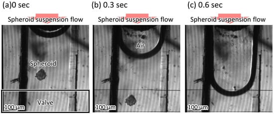 A suspension including spheroids was introduced into the trapezoid-shaped liquid channel. The depth of the liquid channel was 225 m, while the spheroids’ diameter was 200 m. The spheroids could pass through the microvalve without clogging (Figure 9, Video S1), and then the microvalve was used to stop the flow of the suspension. Figure 10 shows the relationship between the applied pressures and the mean velocities of the microbeads flowing in the microchannel. The mean velocities of the flowing microbeads were 656 m/s, 53 m/s, 55 m/s, 65 m/s, and 0 m/s, when the applied pressures were 0 kPa, 50 kPa, 100 kPa, 150 kPa, and 200 kPa, respectively. According to the experiment, the microvalve was able to stop the flow of the suspension at 200 kPa in applied pressure.