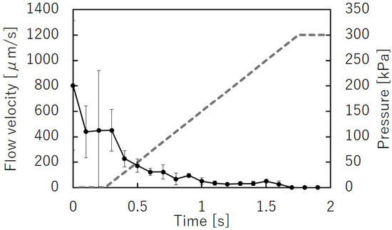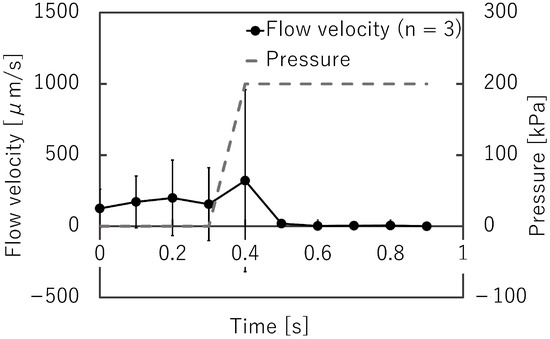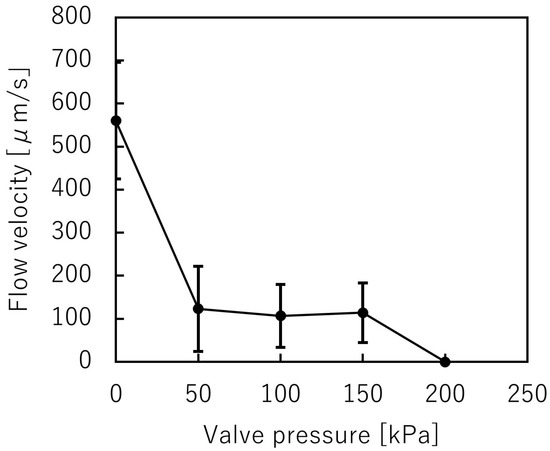 Figure 12 shows the microbeads flowing in the liquid channel at the valve position. The suspended beads flowed through the liquid microchannel while the microvalve was open (Figure 12a). The flow of the microbeads was stopped when the microvalve was closed (Figure 12b). This indicates that the liquid microchannel, including the inner angles, was completely closed. The beads started to flow again when the microvalve was reopened (Figure 12c). Figure 13 shows the time variations of the mean velocity of the flowing beads and the pressure applied to the pneumatic microchannel (n = 3). The microvalve was closed 0.4 s after the pressure of 200 kPa was applied. When the pressure was applied to the balloon, the fluid flowing just below the balloon was pushed out, resulting in faster flow velocity downstream. In this experiment, the flow velocity downstream of the balloon was measured. Due to the pressurization of the balloon, the flow velocity increased temporarily as shown in Figure 13. Video S2 shows the operation of the microvalve. The microvalve with the microchannel of 350 m depth was also tested. Figure 14 shows the time variations of the mean velocity of the flowing beads and the pressure applied to the pneumatic microchannel. The pressure applied to the pneumatic channel was gradually increased from 0 kPa to 300 kPa to avoid breaking the seal between the membrane and the pneumatic channel. Video S3 shows the operation of the microvalve. The maximum depth of the microchannel valve that could be sealed in this test was 350 m. The valve could repeatedly open and close 328 times before corruption (S.D. = 15.7, n = 3).