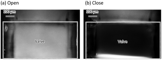 Figure 11 shows the difference in the images of the microvalve operation with and without fluorescent dye. The source images of the difference images are shown in Figure S1. The channel corner was filled with the water dyed with Rhodamine when the valve was open (Figure 11a). When the valve was closed, the fluorescence at the channel corner could not be observed (Figure 11b). This indicates that the channel corner is completely closed.