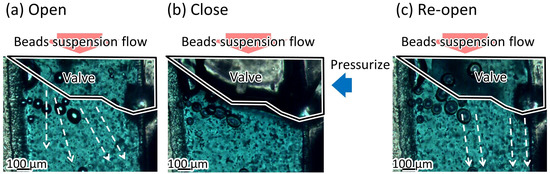 Damming of the beads’ suspension flow using the microvalve. (a) Beads in the bead suspension pass through the microvalve when the microvalve is open; (b) beads stop when the microvalve is closed; (c) beads flow againg when the microvalve is reopened.
