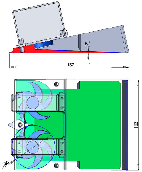 The main function of the machine is to peel a thin surface layer of soil using two rotating blades and to collect particles via gravity at the back of the machine. In order to reduce the duration of the simulation for relatively small particles (1 mm), a small machine was designed. The exact dimensions of the concept are shown in the Figure 2.