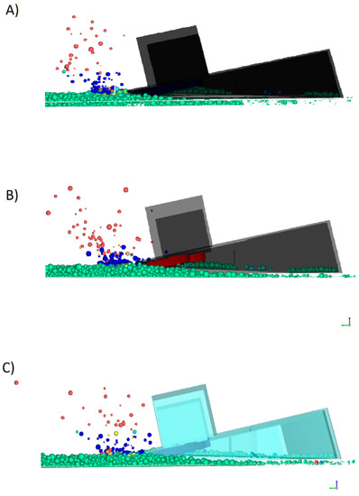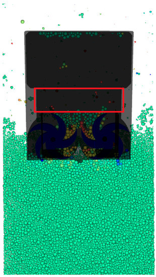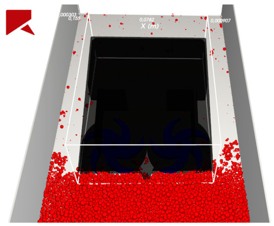 All geometries used in the simulations were prepared in the .stl format and the initial conditions for each simulation were the same as it is shown in Figure 3 and Figure 4. The filling of the container with particles took place by sprinkling and free arrangement of the particles under the influence of gravity—the goal was to achieve the desired bed height—the same as the top cutting edge and equal to 12 mm.