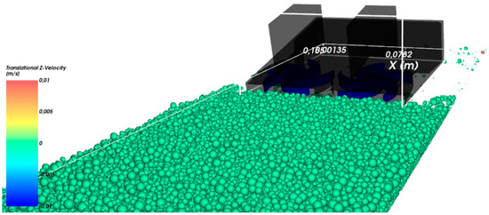 Total tangential stiffness in contact was also assumed. Such assumptions are best suited to ideal spherical shapes used in the experiment. Due to limited computational capabilities, the duration of the simulation was limited to 8 s. During this time, the harvester moved at a speed of 0.01 m/s, and its blades rotated at a speed of 2 rad/s, collecting spherical particles. Despite such a short simulation time, computing on one GPU card took over 24 h for each calculation. In Section 5, the results obtained for three different values of gravitational acceleration, corresponding to those on the Earth, Moon, and Mars, are presented. Collecting process is shown in Figure 5.