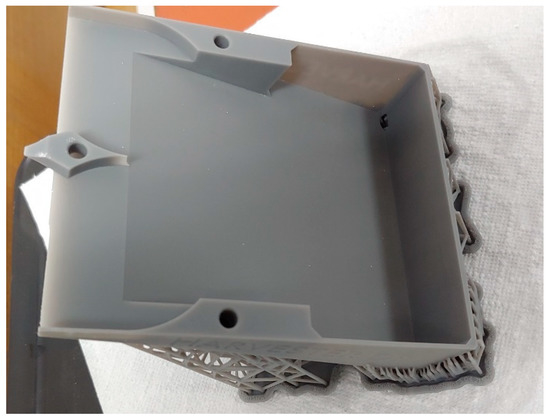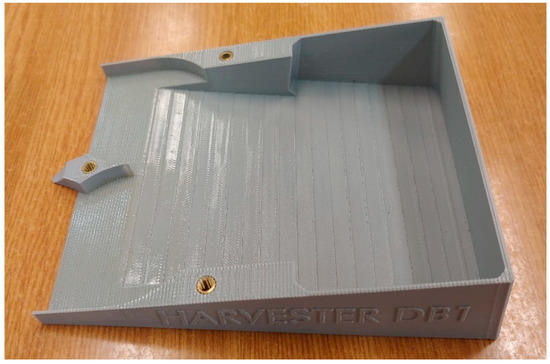 The SLA technology consists of hardening a liquid photopolymer with a UV laser beam. The object, as in any 3D printing technology, is created layer by layer, while this technology achieves a much higher resolution and, thus, higher accuracy of the produced parts. The main advantage of the SLA technology is that it has the highest accuracy/resolution among 3D printing technologies. For Formlabs FORM 3 printer, it is 0.025 mm in the XY plane and 0.025–0.300 mm in the Z direction (depending on the layer set). This printer uses the LFS (low-force stereolithography) technology, which reduces the forces tearing the part when removing individual print layers from the FEP film. As a result, the printed elements have an exceptionally smooth surface and are free from imperfections. This technology is much more expensive than FDM, a liter of photopolymer costs from $180 to $340. Photopolymer resin is toxic and can cause chemical burns, therefore, it is necessary to use appropriate protective equipment and a dedicated workplace. Parts leaving the printer are not ready for use and require further processing. The first step is to wash off any remaining uncured resin with an isopropyl alcohol bath. After bathing in IPA, the printout requires 3 h of “standing” until the remnants of the solution evaporate from the element. This process can be accelerated by heating the part to 323 K. The next step is the final hardening of the parts with UV light. The last stage of processing is removing the supports, which are always present in this technology, and grinding the joints. A harvester base produced using SLA technology is shown in the Figure 7.