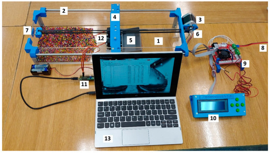 Figure 9. Test stand with equipment: 1—plexiglass box, 2—linear guide, 3—stepper motor, 4—supporting beam, 5—harvester, 6—belt transmission, 7—adjustable tensioner, 8—power supply, 9—microcontroller, 10—control box with display, 11—servo controller, 12—servo motors, 13—PC.