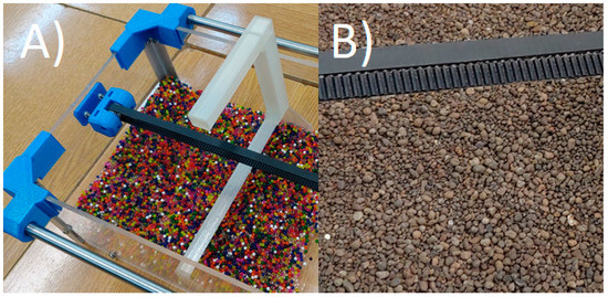 • Particles were poured into the box, which were distributed using a specially prepared tool (Figure 11) to obtain the appropriate material bed height.