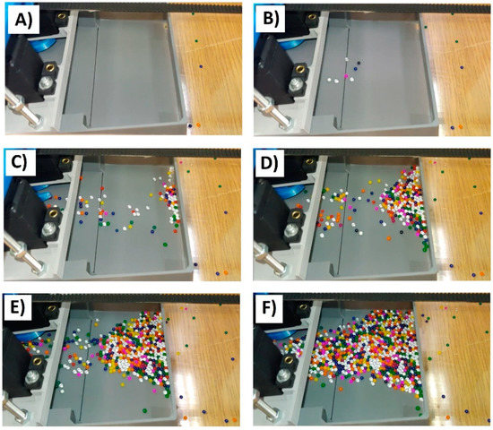 Figure 12. Freeze frames used to calculate the number of particles collected by the harvester at different time points (which passed the black dividing line): (A) experiment start (0 s), (B) after 1.5 s, (C) after 3 s, (D) after 4.5 s, (E) after 6 s, (F) after 7.5 s.