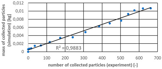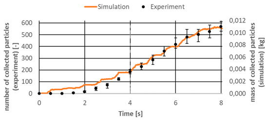 Successful experimental studies were compared with the results obtained using the DEM model. A model was used for the comparison in which the boundary conditions corresponded to the terrestrial conditions. Figure 13 shows a comparison of the particle collection rate for the simulation time of 8 s. As the simulation was developed and took into account particles of different sizes in the 0.5–4 mm range, two different parameters were compared, being their analogs and allowing for a qualitative analysis of the results. The number of particles collected by the machine in the experiment was compared to the mass of collected particles in the DEM simulation.