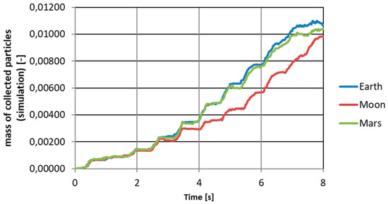For such defined conditions, leaving the remaining boundary conditions as those described in Section 3, the intuitively expected results were obtained—the lower the gravity value, the weaker the effect of collecting particles and the greater the effect of scattering them in the air. In Figure 15, the masses of collected particles vs. time for three different gravity conditions are presented.