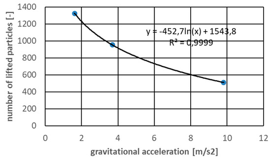 The presented simulation results suggest that the gravity drop becomes important only when is very high. Differences between accelerations of 9.81 m/s2 and 3.70 m/s2 were not as significant as might be expected. In Figure 17, the logarithmic correlation between lifted particles and gravity with a high Pearson correlation factor is presented. The most important question related to this correlation that should be asked is whether it is the effect of the physics of the phenomenon or is it the effect of a defined numerical model? This should certainly be noted in the future.