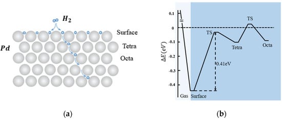 (a) Illustration of hydrogen adsorption in Pd (100) []; (b) diagram of the potential energy profile of hydrogen-absorption []. Copyright (2017), with permission from American Chemical Society.