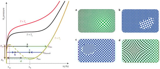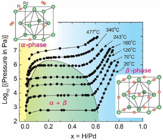 H2 pressure–composition–temperature (P–C–T) phase diagram of the Pd-H system [,]. Copyright (2019), with permission from Chemistry Europe.