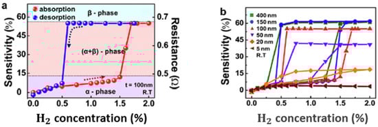 Available work went beyond the surface of the Pd material to determine how the thickness affects sensing performance. In [], Lee et al. have examined Pd thin films’ sensitivity of variant thickness, from 5 nm to 400 nm. The results in Figure 3a show a sensitivity curve during the process of hydrogen absorption (red curve, from the bottom going towards higher H2 concentration until there is a quick increase of sensitivity), and the process of hydrogen desorption (blue curve, from the most upper right side, going towards lower H2 concentration until there is a sharp decrease of the sensitivity in the end). The cycle formed around the area of α- and β-phases is also called hysteretic behaviour. During the interacting process of hydrogen and Pd, free electrons from hydrogen can move through and thus affect the electrical resistance within the thin film. Let be the thickness of a Pd film. As Figure 3b shows, by 5 nm thickness, the process of hydrogen absorption and desorption forms a relatively flat curve at a quite low sensitivity level. Each curve with t between 20 nm and 400 nm shows a hysteretic behaviour covering a lower and an upper sensitivity range, with H2 concentration ranging from 0.25% to 1.75%. Observation of these curves indicates that the range of sensitivity that can be covered increases when increases from 20 nm to 150 nm. The highest sensitivity level that a Pd thin film can reach also increases when the thickness of the film increases. These curves reach the highest sensitivity value at 150 nm, where a larger does not result in a better sensitivity level. This saturation of sensitivity can be attributed to the limited depth to which the hydrogen atoms can penetrate Pd material. This limited penetration depth also means that the phase transition occurs mainly near the surface region of the Pd thin film. However, the low sensitivity level of the 5 nm-thick films indicates that the too-small thickness can restrain the capacity of the absorption of hydrogen atoms and the Pd lattice expansion.