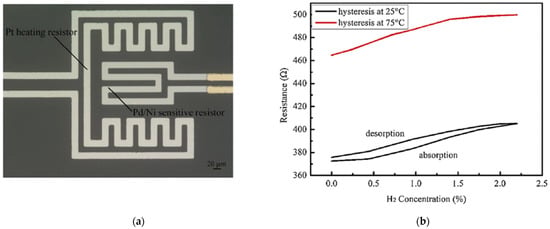 (a) The optical microscope image of the Pd/Ni sensor and (b) the hysteresis of hydrogen absorption and desorption at 25 °C and 75 °C []. Copyright (2019), with permission from Elsevier.