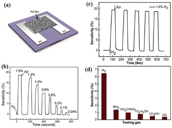 Hu et al. in [] developed an innovative processing method to improve sensing properties through a new nanoporous-structure of Pd thin film for H2 sensing applications with a specific surface-volume ratio. In their work, a nanoporous structural Pd thin film was achieved through DC sputtering and followed by annealed process under vacuum conditions. Specifically, the porous structure was formed by the competition between the melting of ultrathin Pd film and the surface tension effect during the annealing process. With the optimized annealing temperature of 300 °C, the Pd film exhibited significant sensing properties, with a response time of ~25 s, and a recovery time of about 10 s due to the sizeable reactive surface of the porous structure. The sensor had a wide concentration range of 0.04–1.6%. Additionally, as Figure 6 shows, the sensor exhibits good repeatability, and its sensitivity towards hydrogen was about 6–10 times higher than other reductive gases, like CO, NH3, CH3OH., at room temperature.