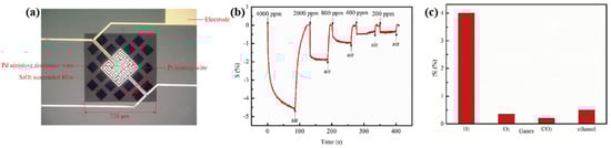 (a) Microscope image of a hydrogen sensor sample. (b) Responses of different H2 concentrations at 400 °C, and (c) responses of the sensor to various gases (4000 ppm) at 400 °C []. Copyright (2019), with permission from Elsevier.