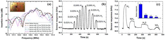 (a) Measured frequency responses of the proposed sensing device depending on the Pd–Ni thin-film thickness, inset: picture of the prepared sensing device; (b) measured sensor responses relating to the 40 nm Pd–Ni alloy thin-film coated sensing device to various hydrogen gas concentrations; (c) selectivity testing of the proposed Pd–Ni alloy thin-film coated sensing device []. Copyright (2017), with permission from MDPI.