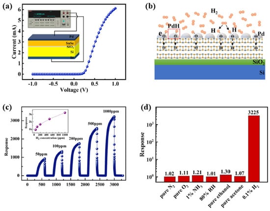 (a) The I–V curve of a SnSe/SiO2/Si heterojunction. The inset shows a schematic illustration of the measurements. (b) Schematic illustration of the sensing behaviour of the Pd-decorated SnSe/SiO2/Si heterojunction towards H2. (c) The consecutive dynamic response of the heterojunction upon exposure to the above concentrations of H2. The inset shows the dependence of the response on the H2 concentration. (d) The sensor’s response to pure N2, O2, ethanol and acetone, 10,000 ppm NH3, 80% relative humidity (RH) (H2O) and 1000 ppm H2 []. Copyright (2021), with permission from Elsevier.