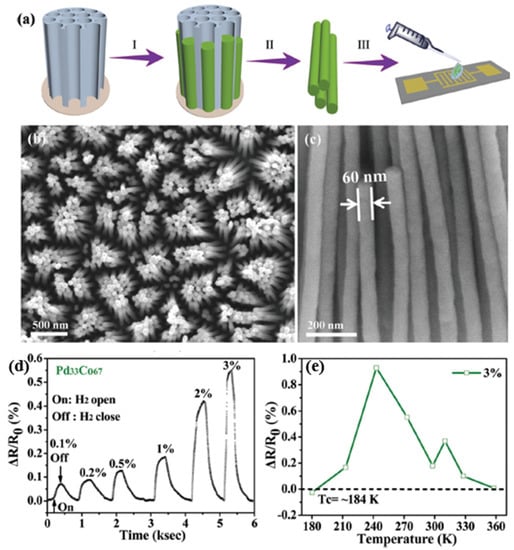 Du et al. investigated PdCo NW sensors for hydrogen gas sensing over a wide range of temperatures []. As shown in Figure 10, the PdCo NW (diameter 60 nm) was fabricated by electrodeposition within an anode aluminium oxide (AAO) nanochannel and further integrated on the test interdigital electrodes (IDE). The sensing performance and stability can be modified by tuning the cobalt Co dopant content. Compared with different Co contents, has a better sensitivity of about 0.2% but a slower response/recovery time of over 200 s/500 s, at 1% H2 concentration at a temperature of 273 K, as shown in Figure 10d. Interestingly, the response of the PdCo NW decreases with increasing temperature. The critical temperature for the “reverse sensing behavior” of PdCo NWs is far below room temperature compared to the pristine Pd NWs ( = 287 K) [], see Figure 10e. The improvement expanded the low-temperature range and stability of hydrogen sensing.