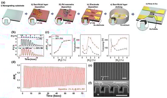 Lee et al. proposed a partially anchored Pd nanowire (PA-PdNW) to enhance the durability of Pd nanowire-based H2 sensors. Because most of the structure was not restrained from the volume expansion, PA-PdNW could relieve the internal mechanical stress and thus improve the reliability of the sensor device even it was repeatedly exposed to high concentrations of H2 []. Schematically, Figure 11a demonstrates the fabrication process of the PA-PdNW H2 sensor. Aluminium oxide was first deposited on a silicon nanograting and then further deposited with copper (Cu) at an oblique angle during the process. After selective etching, the Cu layer was processed by Pd-deposition for the sensing, forming a partially anchored and suspended Pd nanowire structure. Then, the Cu layer was removed as the sacrificial layer. Figure 11d shows the sensing response of Pa-PdNW sensors in dry and 85% relative humidity (RH) environments. However, the sensors showed no significant sensitivity difference in both cases. Although the solubility of H2 in Pd was almost unaffected by the two different humidity levels, the a-β-phase transition could still be observed at H2 concentrations greater than or equal to 2.5%. On the other side, the response/recovery time increased significantly with increasing humidity due to the thin water layer on the surface that delays the hydrogen absorption []. Increasing the temperature of the nanowire by applying a heater can significantly reduce the delaying effect caused by high humidity [].