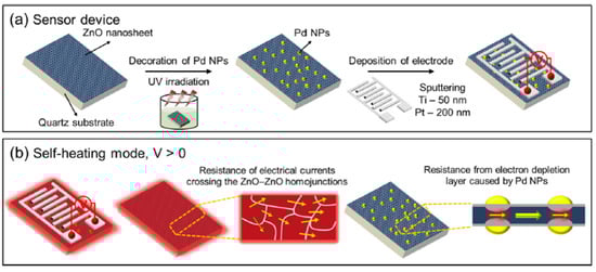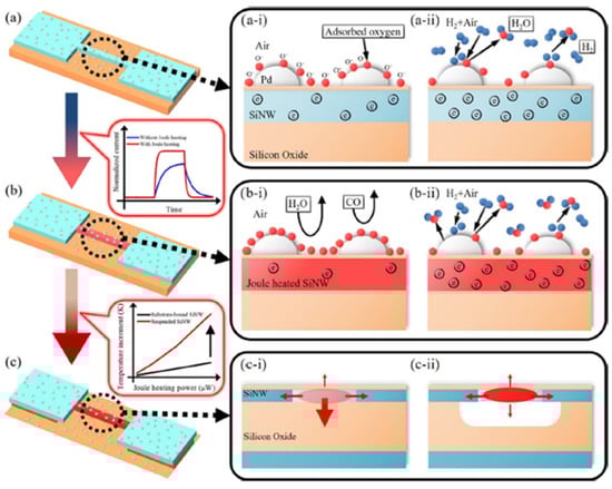 In order to improve the sensitivity while lowering the power consumption, Yun et al. [] developed self-heating, suspended, and palladium-decorated silicon nanowires (Pd-SiNWs) for high-performance hydrogen (H2) gas sensing. The suspended SiNWs can significantly lower the power consumption by reducing the heat loss through the substrate. Surface modification with Pd can react with H2 at room temperature, but this reaction is slow and can be influenced by humidity or carbon monoxide in the environment (see Figure 12a). Figure 12b,c show the Joule-heating mechanism of the self-heating and suspended structures at lower power consumption, increasing the reaction rate and reducing the degradation caused by humidity or carbon monoxide gas. According to available studies [,], the sensitivities of Pd nanowires for H2 gas are lowered when applying Joule heating because of the low solubility of H2 at high temperatures. In this work [], Yun et al. developed a Joule heating method for Pd-SiNW, which can accelerate the response to H2 gas without sacrificing sensitivity.