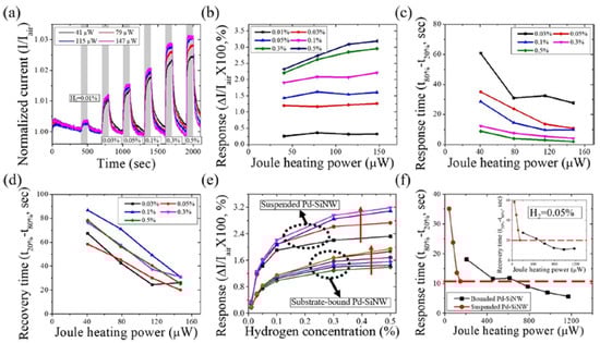H2 gas sensing of the suspended Pd-SiNW sensor: (a) normalized current with Joule heating powers of 41, 79, 115, and 147 μW. The (b) response, (c) response time and (d) recovery time for variant H2 concentrations at four Joule heating powers. Comparison between the substrate-bound and suspended Pd-SiNW sensors: (e) responses at various Joule heating powers (red arrows: direction of Joule heating power increment (from 41 to 147 μW for the suspended Pd-SiNW and from 205 to 1172 μW for the substrate-bound Pd-SiNW)) and (f) response time and recovery time (inset in (f)) for 0.05% H2 (red dotted line indicates the similarity of transient behaviour between the suspended Pd-SiNW at a Joule heating power of 147 and the substrate-bound Pd-SiNW at a Joule heating power of 613 μW) []. Copyright (2019), with permission from American Chemical Society.
