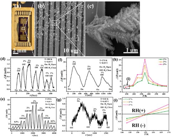 A hydrogen sensor of Pd/Bi/Cu HNAs, SEM images and elemental mapping analysis. (a) The sensor prototype. (b,c) SEM images of Pd/Bi/Cu HNAs on IDE electrode and the magnified SEM image from the dashed rectangle in (b). Response of hydrogen sensor integrated with multiple HNAs. (d–g) ΔR plots with the representative temperature at 388 K, 298 K, 273 K, and 143 K, respectively. (h,i) The summarized temperature-dependent ΔR plots of Pd/Bi/Cu HNAs sensors. The resistance modes, negative values (below T_C), corresponds to the RH (−) mode and positive ones to the RH (+) mode. Here, on: introducing Hydrogen, off: venting hydrogen, ΔR: alteration of resistance []. Copyright (2019), with permission from American Chemical Society.