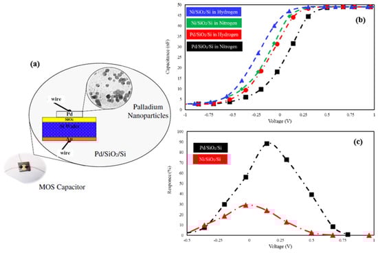 (a) Schematic diagram of the Pd/SiO2/Si capacitor. (b) Experimental values of the C–V curves for the Pd/SiO2/Si sensor at room temperature and the Ni/SiO2/Si sensor at 100 kHz frequency in a mixture of pure nitrogen and 1% H2–N2 at 140 °C. (c) The response (%) of the Pd/SiO2/Si and Ni/SiO2/Si MOS capacitor sensors in 1% H2–N2 mixtures []. Copyright (2017), with permission from World Scientific.