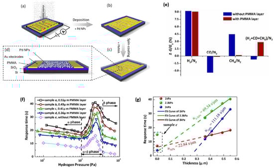 Schematic illustration of the procedure used to fabricate the hydrogen sensor based on a poly (methyl methacrylate) (PMMA)-membrane-coated Pd nanoparticle (NP) film. (a) The deposition of Pd NPs. (b) The Pd NP film formed on the interdigital electrode substrate after the NP deposition. (c) The PMMA-membrane-coated Pd NP film fabricated by spin coating. (d) The structure of the hydrogen sensor based on the PMMA-membrane coated Pd NP film. (e) The response of sensors with and without a PMMA membrane layer to target gas mixtures. The concentration of CO/N2, CH4/N2 and H2/N2 was 1000 ppm. The tested mixed gas of H2, CO and CH4 in N2 was formed by simultaneously filling the three kinds of gas into the test chamber. (f) Response time as a function of hydrogen pressure for five samples of different thicknesses (a–e). The dashed lines indicate the boundaries of the three hydride phase regions. (g) Plots of the response time versus the thickness of the PMMA membrane layer []. Copyright (2017), with permission from American Chemical Society.