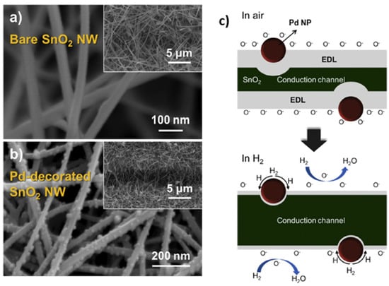 Field-emission scanning electron microscope (FE-SEM) micrographs of (a) bare SnO2 NWs and (b) Pd-decorated SnO2 NWs. Upper-right inserts are the top-view of the FE-SEM images. (c) The sensing mechanism of Pd-decorated SnO2 NWs []. Copyright (2017), with permission from Elsevier.
