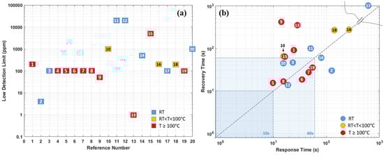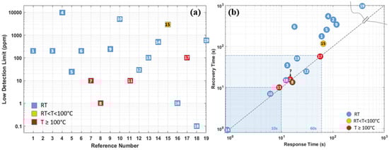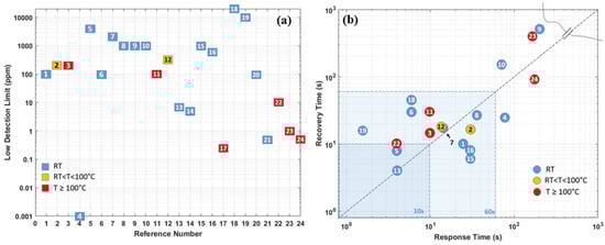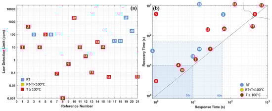 Regarding Table 1, schematic illustrations of the comparison of the reported Pd-based hydrogen gas sensors in literature: (a) low detection limits. The x-axis “Reference Number” represents the 1st column“Ref. Nr.“ in Table 1. (b) Response time/recovery time under experimental conditions as reported in the literature.