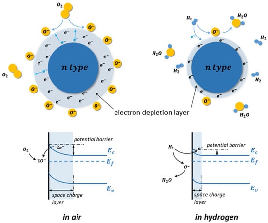 Taking n-type MOS such as SnO2 or TiO2, for instance, at elevated temperature in the air atmosphere, the oxygen molecules (O2) are chemisorbed on the surface of the MOS, as shown in Figure 19. Since O2 molecules are oxidizing gas and act as acceptors of electrons, they are dissociated on the surface and ionized into species such as , , and by trapping electrons from the conduction band of the n-type MOS, as indicated in Equations (1)–(4). The ionizations of these chemisorbed species are temperature dependent. The is dominant at temperatures lower than 150 °C, has its range from 150 to 400 °C, and is at temperatures larger than 400 °C [,].